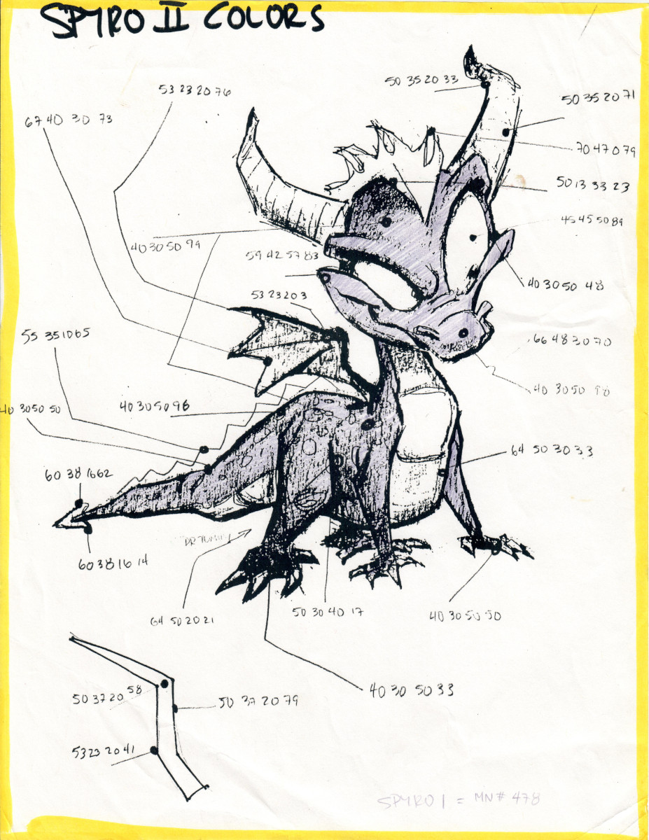 Here we see some early art of Spyro. The first is of Craig Stitt's initial design, which would later be dropped in favour of Zembillas' design, seen in the rest of the images. Spyro's original green colour scheme can also be seen here, as well as a colour diagram used for Spyro 2.