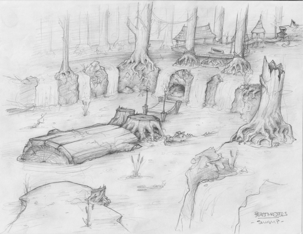 Lastly for now, we've got a few level concepts. These "Beast Masters" concepts would of course eventually become the Beast Makers home. I'm not sure what "Aquatic" is supposed to be (or even which game it's for), but it looks quite Lost Fleet-y.